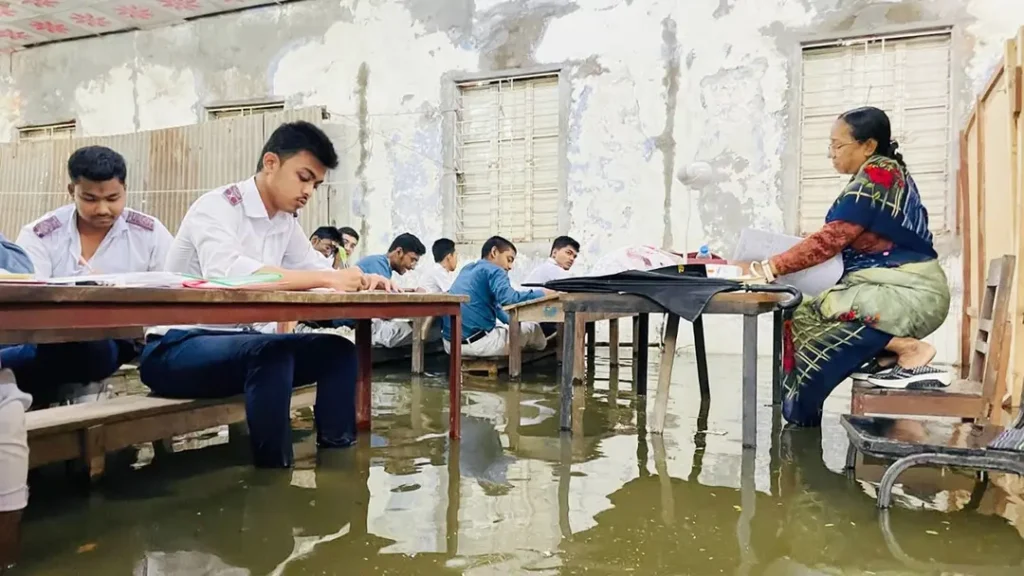 কক্ষে হাঁটু পানি, বেঞ্চে পা তুলে পরীক্ষা দিলো এসএসসি পরীক্ষার্থীরা